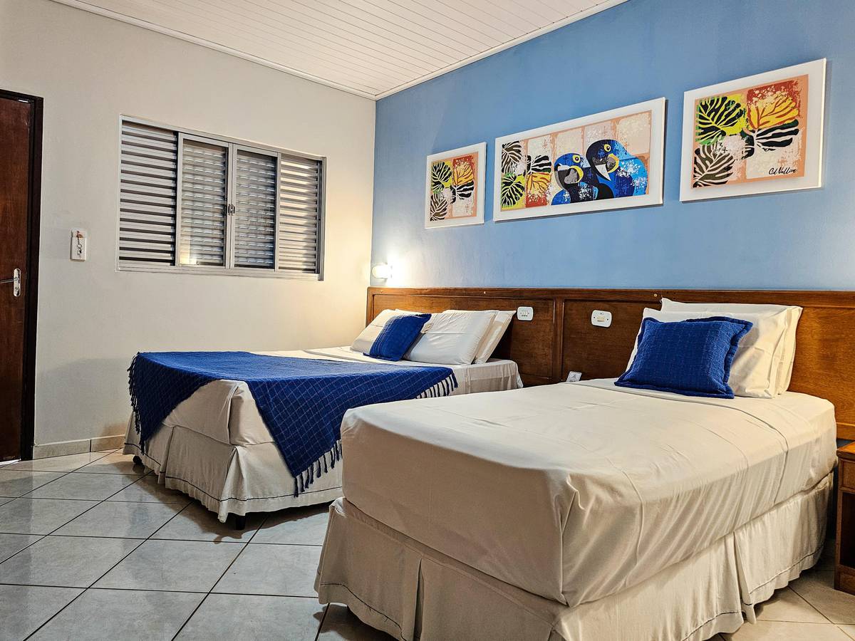 Dispomos de 30 acomodações que podem ser adaptadas para acomodar até cinco pessoas, totalizando 68 leitos. Todas dispõem de ar condicionado, frigobar, TV e banheiro privativo. Crianças de até 7 anos não pagam e são acomodadas em cama extra no quarto dos pais ou responsáveis. O número máximo de camas adicionais permitidas depende do quarto escolhido. PETs são bem vindos com cobrança de taxa única na hospedagem.